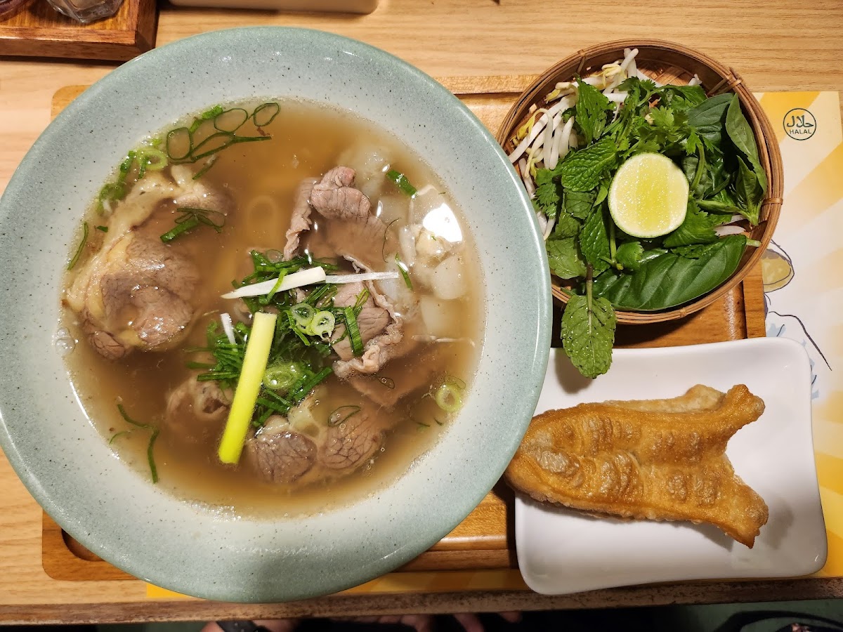 The pho and grilled meat with rice was pretty good—paired nicely with shrimp and fresh veggies.